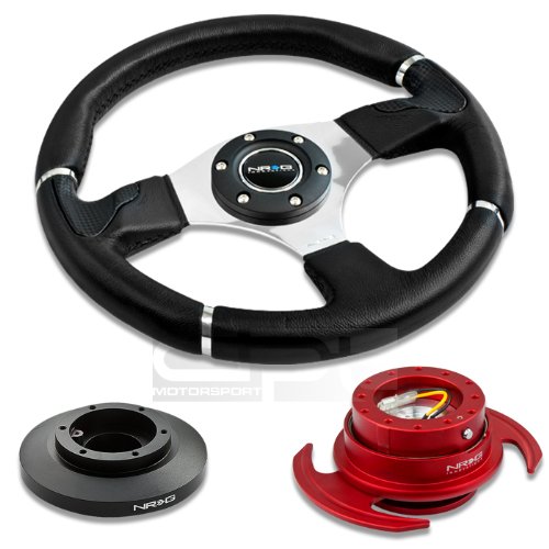 NRG-SRK-E36H+008R+650RD, NRG Innovations 13.78" 350mm Black Leather Racing Steering Wheel Combo with 6 Hole Short Hub Adapter with Gen 3.0 with Handle Red Quick Release Kit SRK-E36H